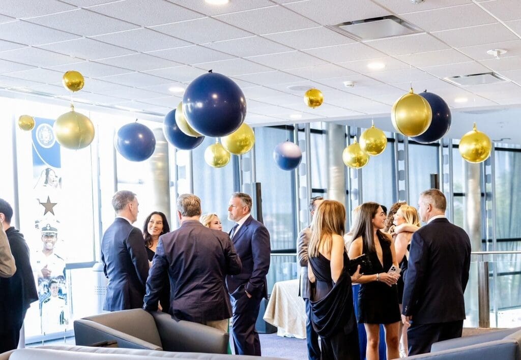 Sleek, modern, and totally unexpected — our hanging balloon installation transformed this USNA graduation into a showstopper.